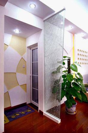 所以,折中的辦法是用玻璃屏風(fēng)來做間隔,用磨砂玻璃這樣半透半遮的材質(zhì),既在空間上起到間隔的作用,又可以借用半透半遮的特殊材質(zhì)所帶來的空間沿展的視覺效果。這樣既可以防止外氣從大門直沖入客廳,同時也可令狹窄的玄關(guān)不顯得太逼仄。
