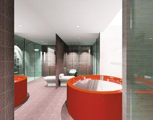 鮮艷奪目的紅色浴缸的大膽利用,讓本來平淡的浴室空間頓時活躍起來,富有個性時尚?! ?/P>