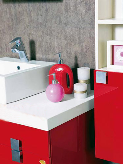 配有紅顏色浴室家具的衛(wèi)浴間,梳洗臺上可選購幾件紅色系的盥洗用品,擺在臺面上很好看,而且還能和家具的顏色形成呼應(yīng)。