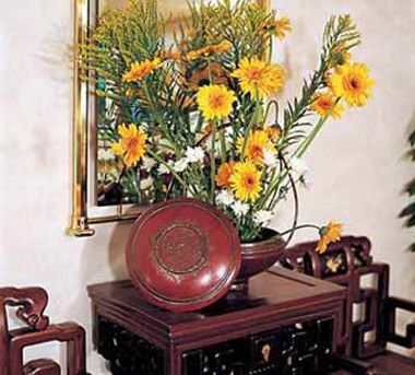 色彩以深色沉穩(wěn)為主,因中式家具色彩一般比較深,這樣整個居室色彩才能協(xié)調(diào),再配以紅色或黃色的靠墊、坐墊就可烘托居室的氛圍,這樣也可以更好的表現(xiàn)古典家具的內(nèi)涵。