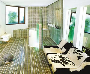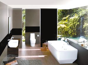 在大面積的衛(wèi)浴空間里,可以將功能細(xì)化。比如洗漱、化妝、沐浴、方便等功能,不以干濕來(lái)分區(qū),而是根據(jù)功能基礎(chǔ),強(qiáng)調(diào)以舒適性分區(qū)。大的衛(wèi)浴空間還應(yīng)加強(qiáng)室內(nèi)外溝通,使光線、視覺(jué)、空氣透暢,出現(xiàn)諸如陽(yáng)光浴室、透明天棚、露天浴室等形態(tài)。