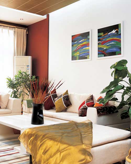 走進(jìn)客廳是一組米白色的沙發(fā),潔白的茶幾,米白的窗簾,豆綠色的很民族風(fēng)味的靠墊,與灰色暗紅調(diào)子的條紋地毯搭配,是鄉(xiāng)村風(fēng)格的淳樸標(biāo)簽。女主人說客廳整體的素色,意味著她可以在未來添置新的裝飾品,而不用擔(dān)心顏色搭配問題。不管是墻角碧綠嬌艷的大盆綠植,還是茶幾上一大束色彩鮮艷的裝飾花,在這個極素的調(diào)子上,都散發(fā)著柔美與溫馨的自然感覺。