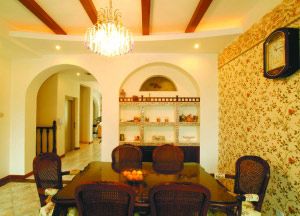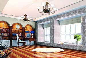 設計思路:該設計的重點是書房的靠墻書架,利用三個圓拱形造型和4個簡化的羅馬柱將整面墻的書架分成三部分,避免了整排書架帶來的壓抑感。而拱形墻面中的大面積黃色與咖啡色的簡化羅馬柱更突出了書房的溫馨與穩(wěn)重的美式格調(diào)。