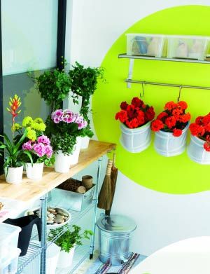 設計思路:休閑區(qū)的墻面用綠色圓形做了背景處理,并在綠**域內(nèi)設置了擱板,便于收納小東西。而在擱板下方,考慮到裝飾性與實用性的結合,利用三個小掛袋放了三盆鮮花,既作為漂亮的墻面裝飾,也可以當作花架使用。三個花盆的重復使用,強調(diào)了墻壁的裝飾作用,使休閑區(qū)更有氣氛。