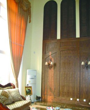 設計思路:這是歐式風格的挑高客廳,電視背景墻采用木頭包墻加歐式壁燈。在電視背景墻的上方是樓上的窗戶,因為要和電視背景墻保持一致,所以做了三個木頭的對開門小窗戶,利用三個同樣的元素設計,使整面墻看起來風格一致,不空虛。