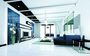 設計思路:這個客廳視覺上看較狹長,為突出它的寬度,特從吊頂上做縱向裝飾。為了讓空間感強烈,采用白色長條形吊頂縱向鋪開,以黑色方形間隔。重復的多個吊頂造型能給墻頂帶來一種動感,在視覺上很有沖擊力,黑白兩色吊頂?shù)奶幚?,也使整個空間更現(xiàn)代更有個性。