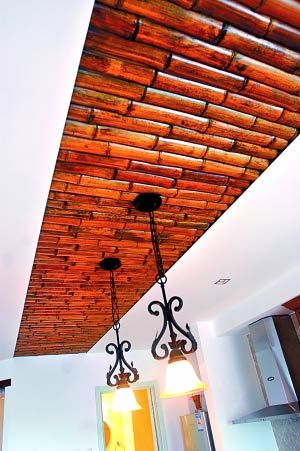 設計思路:本案例中使用的頂面裝飾是把一根根的竹子從中間分開后,依次排列在頂面做好的溝槽中,形成了頭頂上一道美麗的風景。竹子的裝飾充滿自然色彩,與目前所推崇的自然、環(huán)保、綠色家居潮流相契合