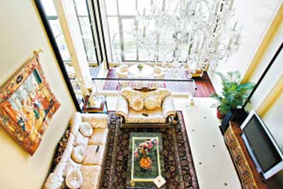 這幢545平方米的豪宅客廳有兩層高、超寬設(shè)計(jì),空間闊綽舒適,以高度詮釋家庭的氣勢(shì),突顯大家奢華。