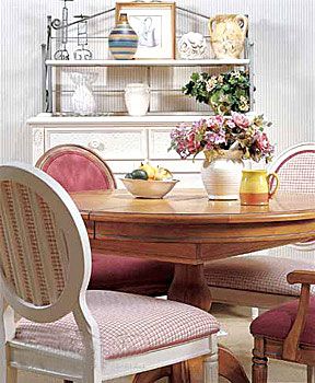 走過(guò)楊先生家開(kāi)敞式的門(mén)廳就能看到相對(duì)而設(shè)的餐廳與廚房。餐廳的整體設(shè)計(jì)很有一種鄉(xiāng)村田園之感。家具采用純實(shí)木制造,造型既簡(jiǎn)約又實(shí)用,而且體現(xiàn)一種很高的品位。