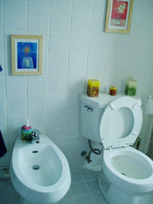 抽水馬桶的沖水槽上方是用廁時達(dá)不到的地方,我們可以利用此空間做一吊柜,深度約15厘米,才不致給人造成不便。柜內(nèi)可放置衛(wèi)生紙、手巾、洗潔劑、女性衛(wèi)生用品等,也可在下部做成開放式,放些綠色植物裝飾。