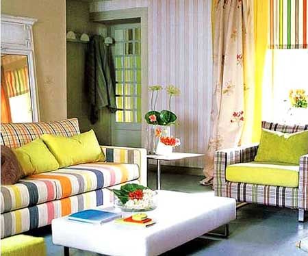 線條搭配花草、格紋等圖案的家飾布料,在混搭中取得異中求同的協(xié)調(diào)性。單純的顏色線條,局部墻面使用,便可把空間中所有不同的元素框在一起,壁紙本身即成為空間里不顯眼的、簡單的背景色。