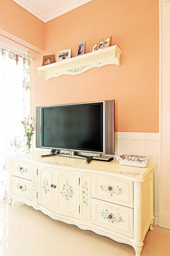 設(shè)計(jì)師透露,屋主為兩夫婦,看慣了舊居的白色布置環(huán)境,期望在新居注入新氣象??汀垙d堂分界鮮明,墻身上半部配用粉橙色,甚為奪目,下半則以條紋式設(shè)計(jì),為平實(shí)的墻身增添動(dòng)感一面??蛷d擺放了鮮紅色布沙發(fā),與一室散發(fā)的田園風(fēng)格甚為匹配。