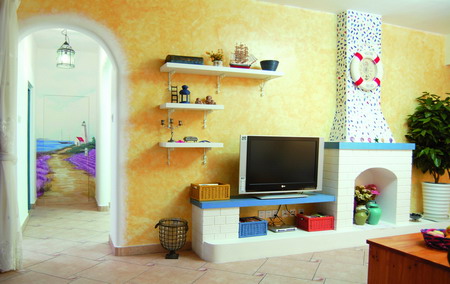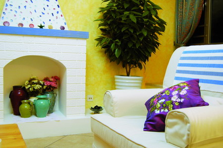 ●空間亮點(diǎn)二:圓拱帶出海洋味。不管是書房的開(kāi)放入口,還是墻上的裝飾閣,整體都是圓拱的形狀。這是地中海風(fēng)格的典型特征之一。制作過(guò)程比較麻煩,先要用木板支模,然后用紅磚砌出拱門,最后用水泥抹面,盡量把線條抹圓潤(rùn)一些;然后刷上白色就可以了。