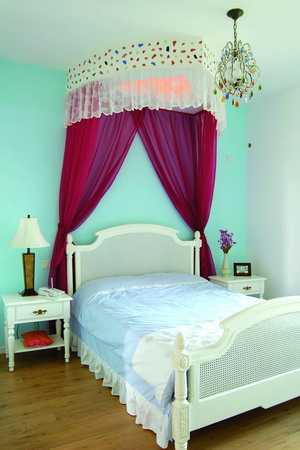 ●空間亮點(diǎn):Lulu自己住的臥室被她裝扮得像一個(gè)小公主的睡房。淡淡的藍(lán)色背景墻下,一顆紅色的心天天俯望著夢(mèng)里的小女孩,旁邊,還有輕紗圍繞。這樣的設(shè)計(jì)讓很多閨中密友羨慕、贊嘆,可也有人說(shuō)它和整體的愛(ài)琴海風(fēng)格不搭配,聰明的讀者,您認(rèn)為呢?