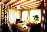 客廳與原陽臺之間的墻體被打掉,設(shè)計師把陽臺地面加高后,鋪設(shè)青石板,使之成為一個休閑臺。窗戶下的墻面砌以石頭作裝飾,并用玻璃作為點(diǎn)綴。在綠色植物的襯托下,柚木木格的吊頂,輕巧的藤制桌椅及草藤編織的燈,增添了些許自然的古韻氣息,令人身心放松。