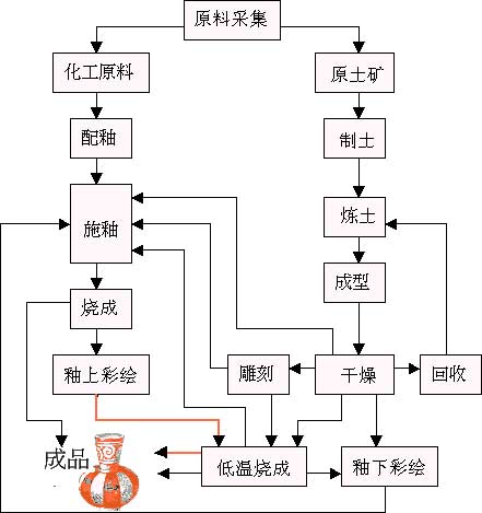 黏土采類(依礦脈大小、顏色品質(zhì)好壞、可塑性及穩(wěn)定性高的粘土,方能成就好的作品)處理純凈(以水簸法,去砂石)練土(為求黏土中水份軟硬一致,消除氣泡,可用獸力、人練、機(jī)器練土)成型加工(手捏、泥條、陶板、拉坯、注漿、鏇坯、擠出、重壓...各成型法作陶)裝飾(以雕塑法,或多色土之變化,可用刮、切、壓、印、黏貼、鑲嵌、鏤空)乾燥(室溫自然陰乾或烘乾35~200℃)裝飾(陰陽(yáng)刻劃,或化妝土)素?zé)s700~850℃或1000~1250℃)(去除坯土中之結(jié)晶水、有機(jī)物、空氣,且可增加坯體強(qiáng)度)上釉(可淋、噴、彩繪、灌、浸...等方法上釉,上釉前先噴少許水份於素坯上,不可施太厚,以防縮釉、裂釉)釉燒(土器950~1100℃、缸器1100~1200℃、硬質(zhì)陶器1180~1280℃、輕質(zhì)瓷960~1050℃、瓷器1300~1400℃、高鋁器1400~1850℃、窯具以電窯、瓦斯窯、柴窯,重油窯)成品——二次燒成法(有釉下彩或單色釉、多重釉彩、結(jié)晶釉)