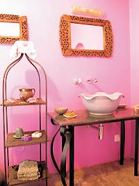 一說到泰國,頭腦中就閃出一個(gè)字“艷”。雖然家具是深栗色,但是泰式的裝飾品多是色澤極為艷麗的。金色、翠綠的紗幔,金色珠簾、真絲靠墊、粉紅的荷花蠟燭……有了這些,深色的家具反而更添香艷意味。