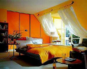 顏色除了能簡單的美化家居環(huán)境,還有調節(jié)人們心情的功能。橙色給人清新快樂的感覺,想讓單調乏味的生活增添活力,讓郁悶的心情開朗明亮起來,你可以在床上放一只色彩溫暖橙色的抱抱熊,在床頭點綴一些可愛的裝飾品。除此之外,橙色還有性感撩人的視覺感受。整面夢幻般的橙紅色的裝飾墻,陪襯樸素的本白色窗簾,都是不錯的搭配選擇。