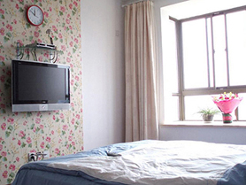 無疑,臥室中最主要的家具應(yīng)該是床,但衣柜的地位也很重要。我選擇了一組實櫸木的衣柜,有三個大抽屜,里面可以放衣服和其它日用品,抽屜上面的開放空間可以方便的放置許多物品,電視置于其中,充分地利用了空間。磨砂玻璃柜門,其質(zhì)感使室內(nèi)顯得明亮開闊。