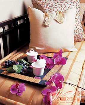 色彩艷麗的紫色槿花,以漂亮的花瓣形狀打動(dòng)人心,放在香茶竹榻間,一種吹著海風(fēng)、安逸舒適的新南亞氛圍撲面而來。