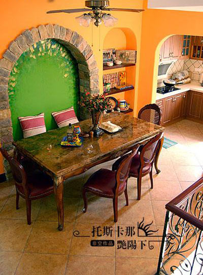 橘 紅色又或是橙色,是生氣勃勃、充滿活力的顏色,是收獲的季節(jié)里特有的色彩。把它用在臥室則不容易使人安靜下來,不利于睡眠。但將橙色用在客廳則會(huì)營造歡快 的氣氛。同時(shí),橙色有誘發(fā)食欲的作用,所以也是裝點(diǎn)餐廳的理想色彩。將橙色和巧克力色或米黃色搭配在一起也很舒暢,巧妙的色彩組合是追求時(shí)尚的年輕人的大 膽嘗試。