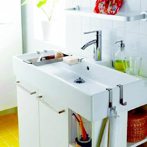 將面盆下方的空間安放儲物柜,面盆上部貼墻的位置釘上10厘米寬的擱板,可以放化妝瓶、刷子、洗漱杯等。擱板高度以不妨礙使用水龍頭為宜,材料可選用木板、玻璃等。