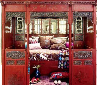 比如,中國的古老的大床,就是一種非??茖W的產(chǎn)品。這種床統(tǒng)稱架子床??煞譃椤杆闹病?,「六柱床」。其它變體形式較多,如月洞門罩架子床等。它三面有40公分高的圍欄,床口兩邊還有40公分寬的圍欄,只留1.2米左右門洞上落床。