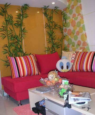 房子是女主人自己設(shè)計(jì),朋友幫忙裝修了,總造價(jià)是5萬元,裝成這樣的效果,絕對是超值。我的家是標(biāo)準(zhǔn)的單室廳,由于房間凈高有四米八,所以廚房及衛(wèi)生間上隔出了一間臥室,一進(jìn)門就可以看見客廳及衛(wèi)生間的墻體,所以種上了竹子增加一抹綠意同時(shí)也擋住了廁所的墻,橙色夾金絲的烤漆玻璃為客廳增加了一些暖意,意思沙發(fā)選用大紅色,也是增加了一種活潑的氣氛 。