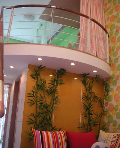 我的家是標(biāo)準(zhǔn)的單室廳,由于房間凈高有四米八,所以廚房及衛(wèi)生間上隔出了一間臥室,一進(jìn)門就可以看見樓上的臥室,所以采用一面落地簾把臥室和客廳分隔開,粉紅色的簾子和臥室地面的粉紅地毯相呼應(yīng),覺得很是柔和溫暖可愛,標(biāo)準(zhǔn)的紅粉女孩的閨房,墻紙也是特地選的彩色的增加一些卡通氣息,背后的翠綠色墻是女主人的最愛,為營造臥室輕松的氛圍起到很好的作用。