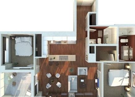 這是一套兩房?jī)蓮d兩衛(wèi)的公寓,因?yàn)槲魇讲惋嬘糜土枯^少,所以廚房都作成敞開(kāi)式,這在下面兩個(gè)案例中也是。這樣做的好處就是建筑師進(jìn)行室內(nèi)房型設(shè)計(jì)的時(shí)候可以避免考慮廚房的影響,而只要增加客廳面積就可以開(kāi)辟出一塊烹飪區(qū)域,并且,客廳、餐廳、廚房聯(lián)體的方式也使這一區(qū)域的利用率、視覺(jué)感覺(jué)都能達(dá)到最大。