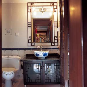 經典的青花瓷器被創(chuàng)造性地改造成洗浴盆,對于傳統(tǒng)精神的把握極富戲劇性,同時,櫥柜的立面造型在裝飾上借鑒了傳統(tǒng)窗花的圖案。