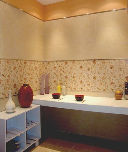 為了能更好地體現(xiàn)仿古磚的使用效果與裝飾內(nèi)格,建議墻磚采用3mm以下灰縫,地磚采用3mm以上灰縫留縫鋪貼。再則,使用恰當顏色的填縫劑作勾縫處理更能起到畫龍點睛的作用。這種鋪貼方法把仿古磚古典而不失規(guī)整、粗獷卻柔合細致,自然但不乏新趣、溫馨中蘊含浪漫的裝飾意境表達得淋漓盡致。