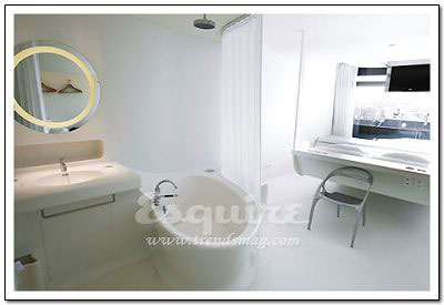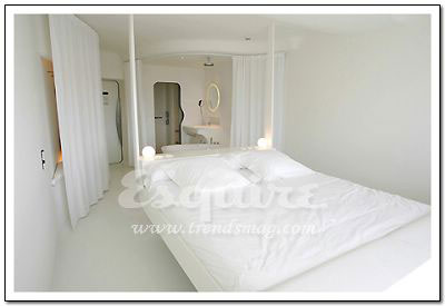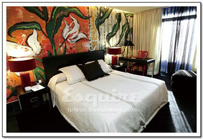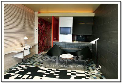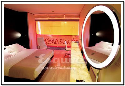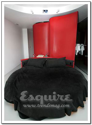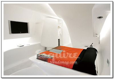深處其中最大的感覺(jué):流動(dòng)。Zaha.Hadid在這套房間中以數(shù)字設(shè)計(jì)的新發(fā)展為基礎(chǔ),用流暢但不規(guī)則的墻壁線條,體現(xiàn)了空間流動(dòng)性的特色,好像一個(gè)漂亮的模具。最不起眼的關(guān)鍵所在:電視機(jī)下的白色遙控器。它控制著屋內(nèi)所有內(nèi)嵌在墻壁內(nèi)的尖端數(shù)字設(shè)備,從激光燈到數(shù)字電視。最值得學(xué)習(xí)的搭配:橘黃色鑲黑的現(xiàn)代主義印花床單。