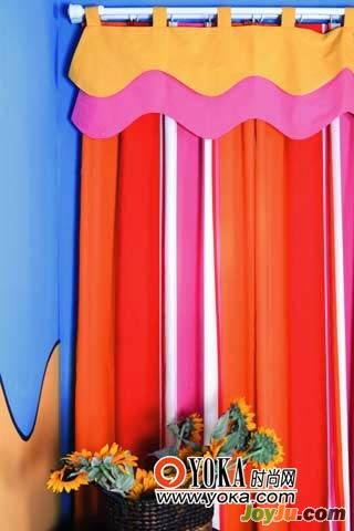 4.用簾眉遮擋簾軌或窗簾頂部懸掛部分,可讓窗簾顯得更整潔大方。游戲室角落的窗簾,用檸檬黃和玫紅色兩層波浪形簾眉修飾窗簾頂部,不僅讓窗簾整體更顯整潔,也讓原本中規(guī)中矩的條紋窗簾生動起來。