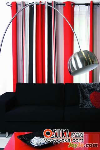 9.窗簾的色彩可以跟室內大型家具的色彩一致,也可以取若干種主要家具的色彩之和??蛷d內的組合沙發(fā)是黑色的,茶幾則是紅色的,而靠墊、果盤等小配飾也采用黑色跟紅色兩種主題色,因此,窗簾選用黑紅色條紋帆布質地,強調室內色彩主題,也將空間內所有色彩元素統(tǒng)一起來,和諧度因此大大增強。