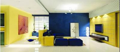 因?yàn)榉块g的面積本身很小,假如做出一個(gè)硬隔斷的話就顯得空間很局促,所以我們首先在地板上,選同種材質(zhì)和顏色的木地板,從地面上看兩者比較協(xié)調(diào),視覺效果比較統(tǒng)一。而在房間的顏色上,選擇黃和藍(lán)兩種互補(bǔ)的顏色,既對立又統(tǒng)一??蛷d的兩面墻用大面積的藍(lán)色和黃色,對比非常鮮明,在家具上,又用藍(lán)色沙發(fā)和黃色的茶幾、角柜交叉點(diǎn)綴??蛷d茶幾下用淺色地毯,既不和木地板沖突,又能劃分出客廳的主要范圍。休閑區(qū)域主要以黃色為主,和客廳的電視墻顏色互相呼應(yīng),達(dá)到最大程度的統(tǒng)一,地臺(tái)上只用了兩個(gè)藍(lán)色靠墊作為點(diǎn)綴,起到畫龍點(diǎn)睛的作用。