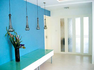 這套居室給人的最大感覺(jué)是淡雅之美。進(jìn)門(mén)玄關(guān)處做了一個(gè)凹面,也擺放著花瓶,有射燈對(duì)著照,光線柔和,將人家的目光引至地面,那里有一個(gè)很小的長(zhǎng)方形玻璃“盒子”,里面盛著些小石子,女人的巧心思在這里得到充分的體現(xiàn)。