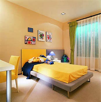 子女房與主臥最大的區(qū)別就在于設(shè)計上要保持相當(dāng)程度的靈活性。子女房只要在區(qū)域上為他們做一個大體的界定,分出大致的休息區(qū)、閱讀區(qū)及衣物儲藏區(qū)就足夠了。在室內(nèi)色彩上吸引孩子是設(shè)計子女房的要點。兒童房間輕易弄臟,裝飾時應(yīng)采用可以清洗及更換的材料,最適合裝飾兒童房間的材料是防水漆和塑料板,而高級壁紙及薄木板等不宜使用。