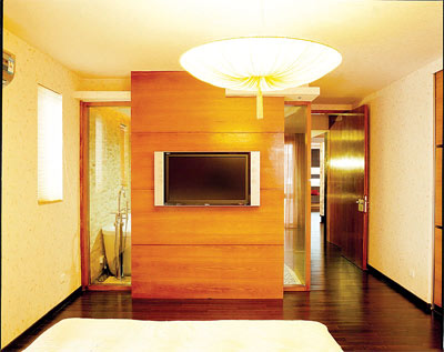 隔斷是營造半開放式主衛(wèi)的重要手段。在床與衛(wèi)生間之間利用一面隔斷,對衛(wèi)生間半遮半隱。而隔斷本身的處理方式也很多,本案例將壁掛電視放在隔斷上,使兩個功能區(qū)隔而不斷。而在色彩搭配上,衛(wèi)生間的色彩效果由墻面、地面材料,連同燈光等融會組成,以清潔感的冷色調(diào)為佳,搭配同類色和類似色為宜。這里衛(wèi)生間的木色邊框和隔斷材質(zhì)保持一致,使這兩部分功能區(qū)有統(tǒng)一的效果,整體感覺溫馨而不凌亂。