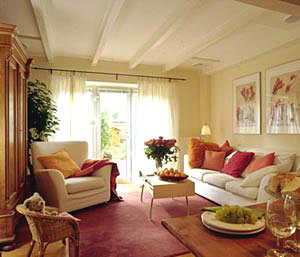 設計師在這個客廳的設計上,刻意追求音樂中的韻律。櫻桃木的實木地板和淺黃色的內(nèi)墻乳膠漆顯得沉穩(wěn)、大度,是整個客廳的“基調(diào)”;而通向陽臺的“啞口”上方的裝飾以及天花板上的假梁和燈具,則是“客廳樂章”的“華彩樂段”。客廳入口的裝飾性書架和陽臺旁的展示架,則是整個樂章的開頭和結(jié)尾。