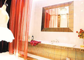 頭上是璀璨的斯華洛世奇水晶吊燈,腳邊環(huán)繞著范思哲的粉色瓷磚,眼前是造型纖巧圓潤(rùn)的唯寶潔具,舉手可以把玩福捷克產(chǎn)的鎦金玻璃花瓶;而變色龍式的酒紅落地幔紗,紅黃綠白紫七彩交錯(cuò),螺旋形水晶燈更將簡(jiǎn)單的浪漫單符彈奏成一首立體的幻想曲。這便是名家建材賣(mài)場(chǎng)里羅曼蒂克衛(wèi)浴套件營(yíng)造的奢華浪漫空間和氛圍。走進(jìn)這浪漫的氛圍,讓人不禁聯(lián)想起白居易的詩(shī):“春寒賜浴華清池,溫泉水滑洗凝脂”。