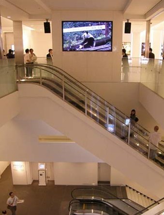 這次“新宿Piccadilly”將夏普108吋液晶設(shè)置在了人流最為集中,通往大廳的電梯附近,基本上從整個樓層都能看到這塊大面積的顯示屏。這款顯示屏將以播放新片預(yù)告片為主。由于現(xiàn)場的室內(nèi)光線較為明亮,因此夏普的液晶能夠很好的勝任這一工作,也擊敗了原本設(shè)計(jì)的背投方案。