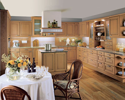 鄉(xiāng)村風格的廚房櫥柜多以實木為主,因為它更接近自然的環(huán)抱,材質以松木、橡木等最為精典,這種風格的代表以歐式廚房及美式廚房為主,歐式鄉(xiāng)村風格在外表上更細膩,色彩較為豐富;美式則更為純樸,寬大的中心島代表了主人對廚房生活的重視。