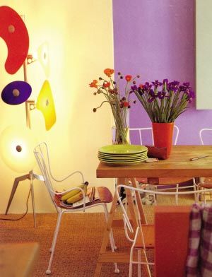 在淡紫與鵝黃色彩柔和的平面上,一個多彩的燈飾,幾乎是抽象派藝術(shù)的翻版,不規(guī)則的外形以及三原色在此都可以看到。從花瓶與插花中,橘色與紫色的平衡,到椅子流暢的線條,每一細(xì)節(jié)無不精心設(shè)計,從而達(dá)到整體的完美。