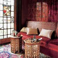 利用先在胡桃木上挖出凹槽,然后鑲嵌貝殼的傳統(tǒng)手工藝方法做成的八角木幾,上面擺放的托盤、玻璃杯和臺(tái)燈,都是典型的摩洛哥風(fēng)格。這一切與果敢而華麗的藝品搭配,營造出艷麗奪目的感覺。有著條紋圖案的金色靠墊,是用綢緞面料做成的。