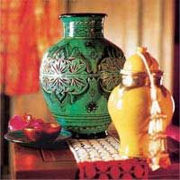 色感華麗的摩洛哥瓷瓶 因?yàn)槲锲繁旧韺⒛β甯顼L(fēng)格特有的色彩感很好地展示了出來,所以即使只有這樣幾件傳統(tǒng)陶瓷制品放在餐桌上,濃郁的摩洛哥風(fēng)情也會(huì)呼之欲出。這樣的瓷瓶,既可以在里面放置物品,也可以單純作為裝飾品。
