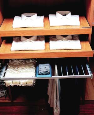 懸掛區(qū) 普通衣桿:衣帽間的掛衣區(qū)要寬敞,每一件吊掛的衣物,都要保持適當(dāng)?shù)木嚯x,不要擁擠在一塊兒。絲質(zhì)、純皮、麂皮等面料的褲子、裙子在用衣夾吊掛時,夾子與衣服之間要墊一層紙,以免產(chǎn)生難看的夾痕。