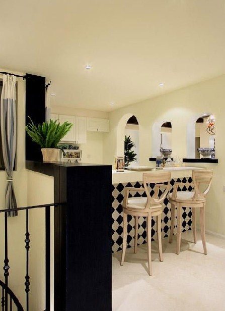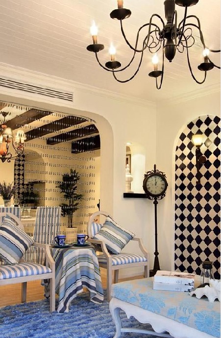 概要: 濃郁地中海特色淺淺的具有不同質(zhì)感與色相的白與藍(lán)色條紋,在家具、墻面、頂棚、梁柱等各個(gè)層面化解延伸,使整個(gè)居室充滿了視覺的清新感,呈現(xiàn)質(zhì)樸、唯美、慵懶的空間氣質(zhì)。鐵藝的立式座鐘整個(gè)空間唯美浪漫。 **厚實(shí)的木質(zhì)家具,蘭白相間的條紋布藝,優(yōu)美的吊頂弧線、典雅的吊燈似乎都在演繹著浪漫。獨(dú)特的設(shè)計(jì)讓空間得以擴(kuò)展與延伸,格調(diào)更具浪漫情懷。