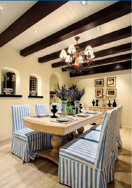 **厚實(shí)的木質(zhì)家具,蘭白相間的條紋布藝,優(yōu)美的吊頂弧線、典雅的吊燈似乎都在演繹著浪漫。