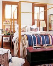 最適合于夏日午后時(shí)光流連的舒適小床,簡(jiǎn)潔的鐵藝床頭富于美感,手感厚實(shí)暖和的白色床罩和窗簾,搭配淺藍(lán)色的墻壁和家具,氣氛寧靜。大小不同的靠墊有很好的裝飾效果。